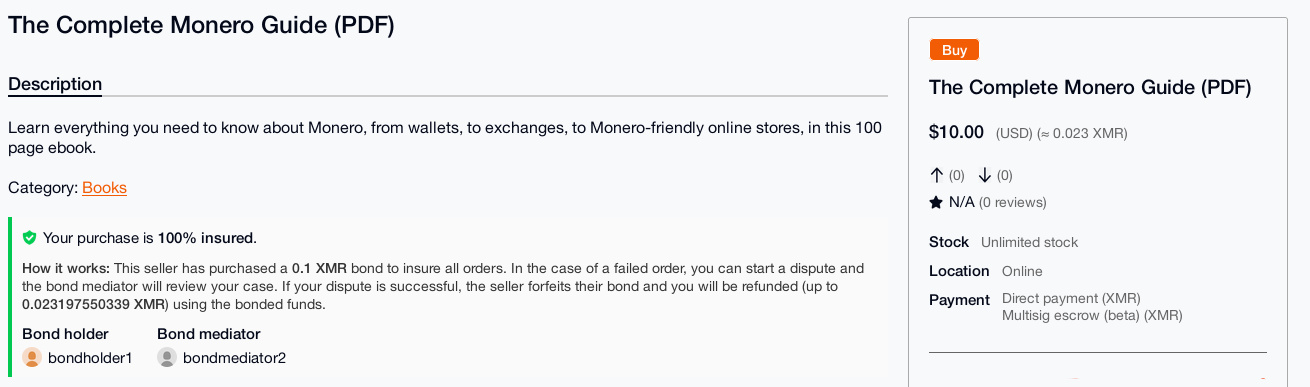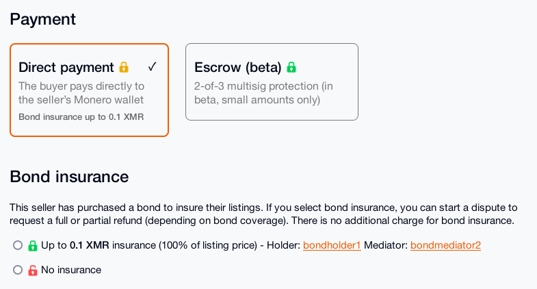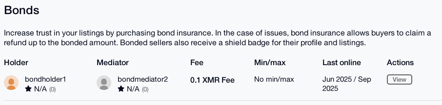 Bond insurance is a convenient alternative to multisig escrow.Bond insurance allows sellers to voluntarily deposit a XMR bond to a bond holder. Buyers can then select bond insurance when making an order, with the assurance that they can get a refund (up to the bonded amount) in case of a dispute. This increases trust and gives your listings a green lock badge.