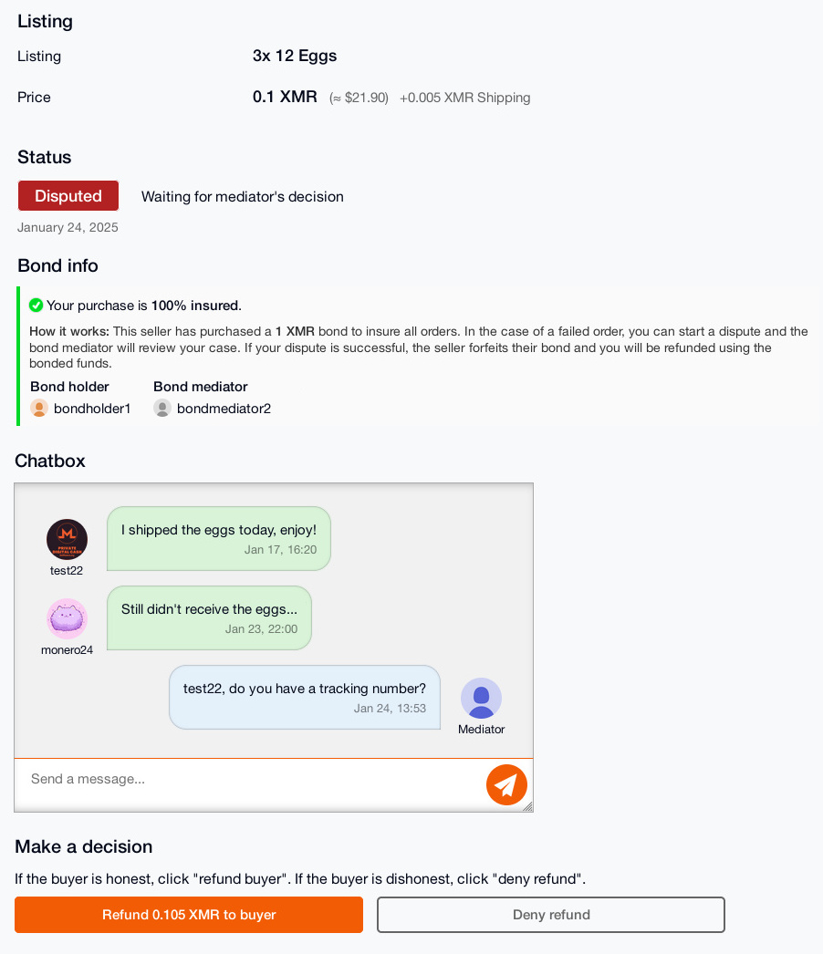 The buyer may choose to start a dispute by clicking on the "Start Dispute" button while the order is in progress. Then the mediator must make a decision and then click on "Refund Buyer" or "Deny Refund". If the mediator grants a refund, the bond holder sends the bonded funds to the buyer's refund address and the seller forfeits any remaining bonds.