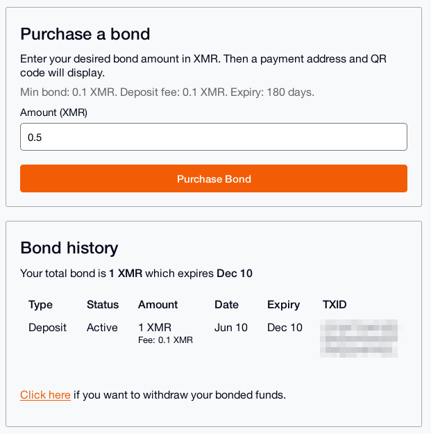 Each bond holder sets their own terms, deposit fees, expiry and renewal periods. Sellers may withdraw their bonds (minus the deposit fee) at any time, unless there is an ongoing dispute or the bond has been forfeited.After the bond expires, there is a renewal period where sellers can renew the bond or withdraw the bond. If the seller does not renew or withdraw the bond during the renewal period, the bonded funds are forfeited to the bond holder.