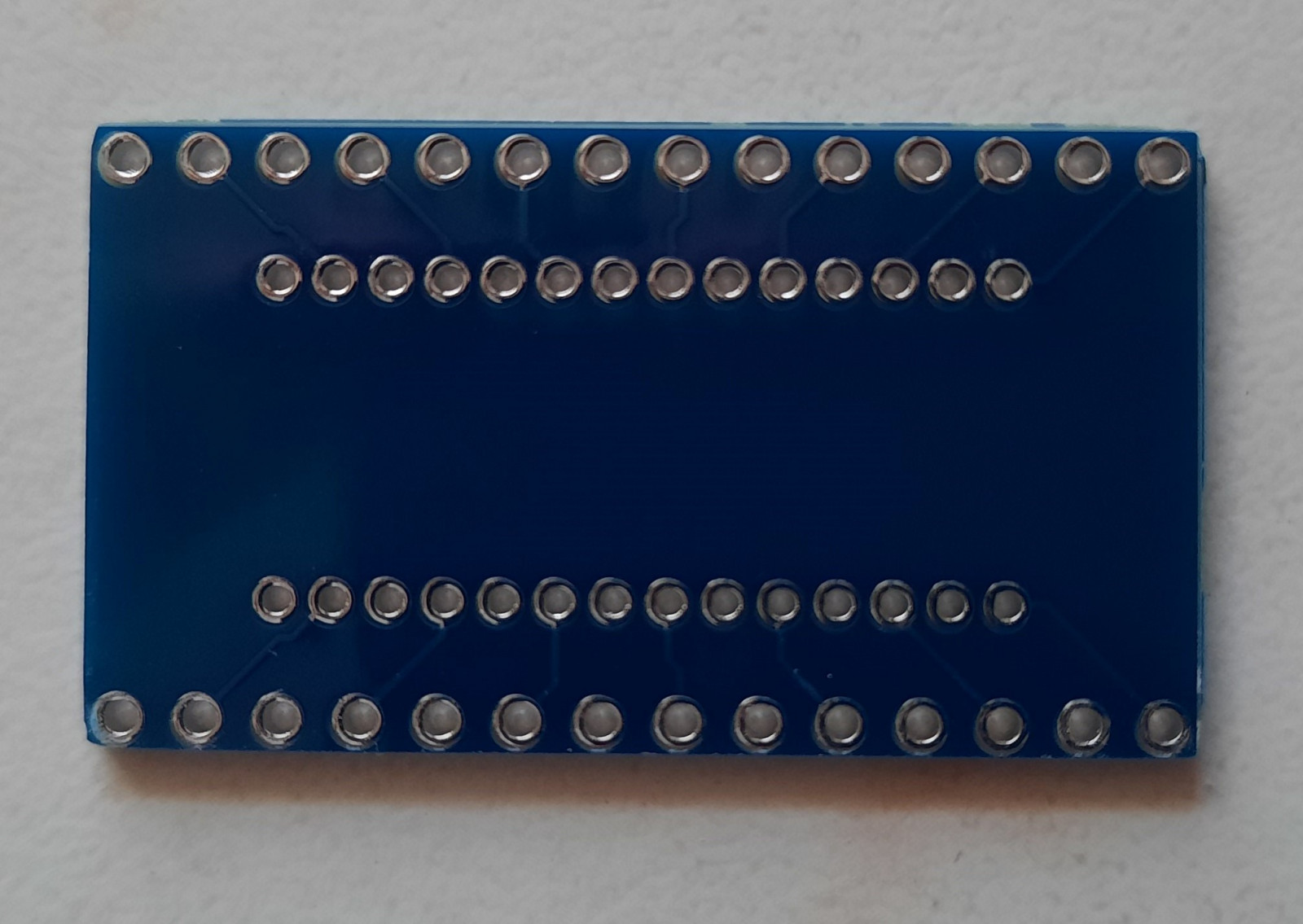 Raster of adapter: 2.54 mm (0.1 in), distance of hole rows 17.78 mm (0.7 in) = 7 breadboard holes