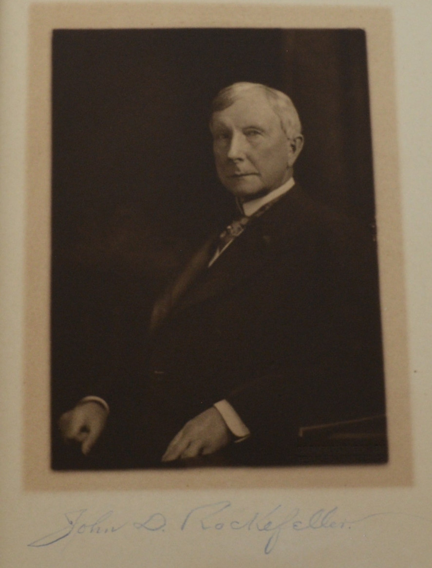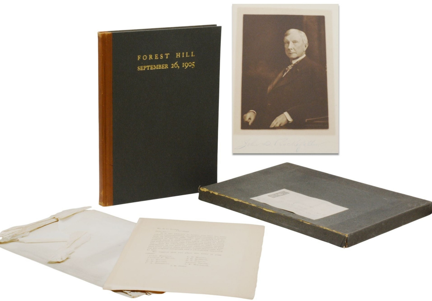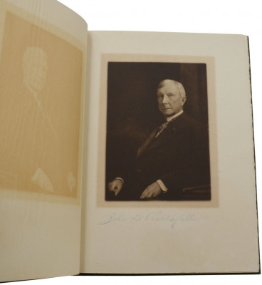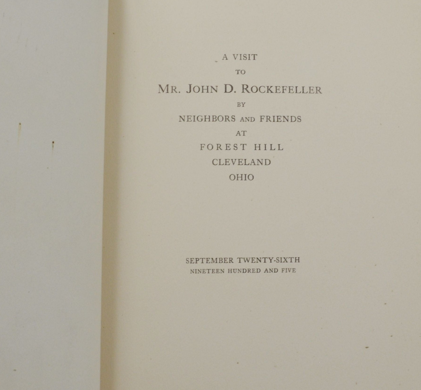 First edition. Signed by John D. Rockefeller beneath his frontispiece; Copy number 255 of a limited 425, for Mr. R. C. Norton of the Baker Motor Vehicle Company of Cleveland. This work commemorates the day John D. Rockefeller, founder of Standard Oil, was visited by 300 Cleveland businessmen outside his home, and includes the speeches which were delivered that day, including ones given by Liberty E. Holden and Andrew Squire, and Rockefeller's speech in response.