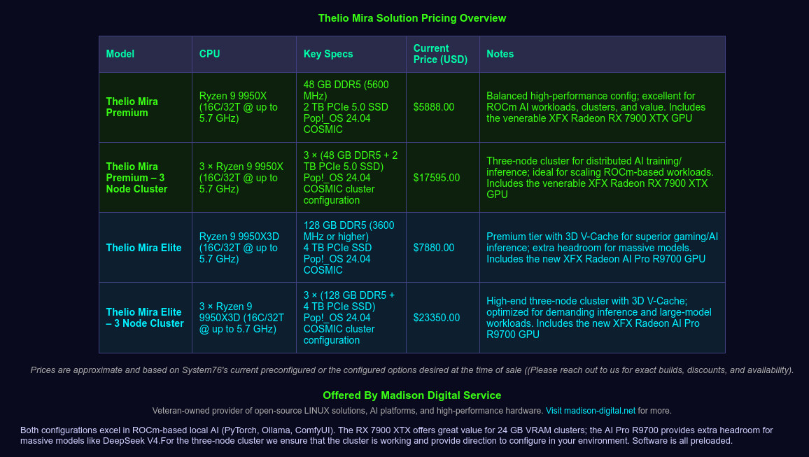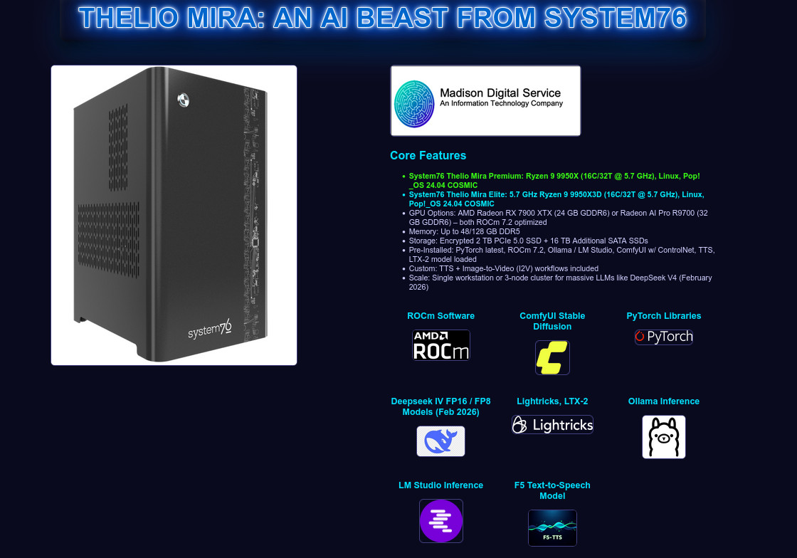 Power up with the Thelio Mira – System76's flagship AI beast, now available through Madison Digital Service! This isn't just a PC; it's a privacy-first, high-performance workstation built for demanding AI workloads, content creation, machine learning, gaming, and professional tasks. Hand-assembled by System76 with open-source-friendly design and delivered + supported by Madison Digital Service (specializing in Linux-first, secure tech solutions since 2021).