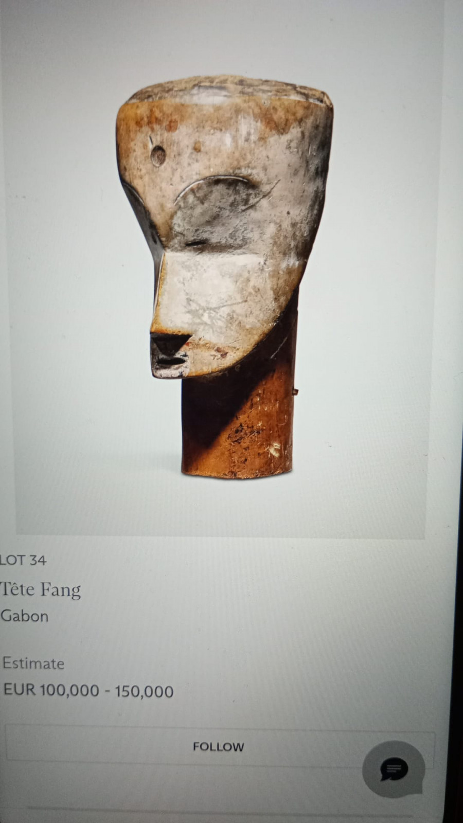 Note the sculptural quality displayed by the artist: the perfect balance of the face, curved like the famous Ngil masks, the white face reminiscent of the Bwiti initiations connecting with deceased ancestors, and the delicacy of the eyes, nose, and mouth, which are almost simply suggested. The stylistic choices found in this piece allow it to be attributed to the Fang Betsi subgroup.