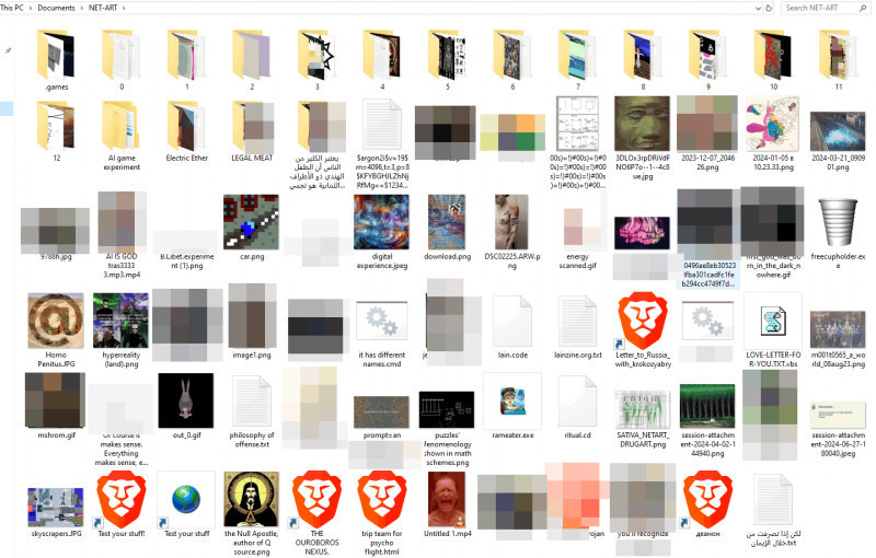 Attached images are some examples. Net-art is available in form of images, videos, text, executable windows applications (exe, cmd, vbs) and links. All safe for your PC, but not necessarily for your identity.