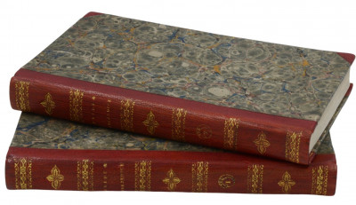 Bound in period-style half red-morocco over marbled boards with spine with an illegible signature in gilt from the binder inside the bottom rear turn-in in each volume. Near Fine. later ownership signature of Dora Taft Brigham to both front free endpaper, two or three blank corners diagonally torn away without loss to text and light soiling to textblock edge in one volume.