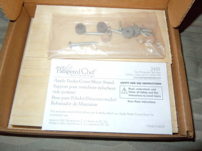 Up for grabs is a Pampered Chef apple peeler slicer corer, complete with a stand. This item has been retired and is no longer available through Pampered Chef.