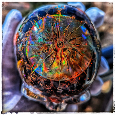 An orgonite skull made of black obsidian, white quartz, mixed agate, stainless steel tumbling media, copper pennies, aluminum jump rings, and metal flake. The crown of the head features a large holographic compass rose with ordinal, cardinal, and secondary intercardinal directions. Black stones like this black obsidian are great at transmuting negative energy.