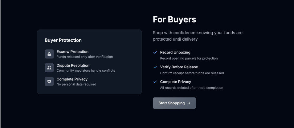 - Completion: After delivery confirmation, funds released. All records deleted for privacy