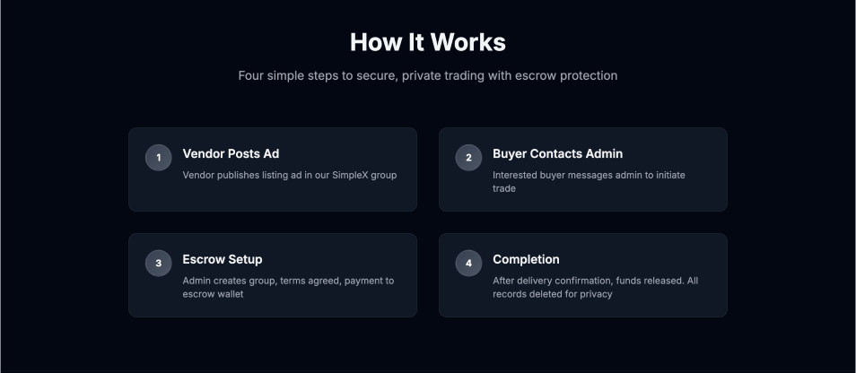 How It Works - Four simple steps to secure, private trading with escrow protection
