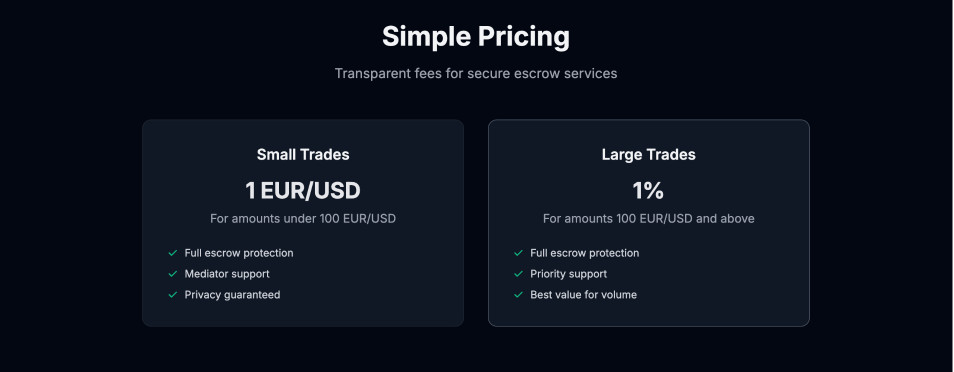 Secure escrow services with community trusted mediators. Trade with complete privacy through SimpleX groups.