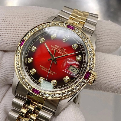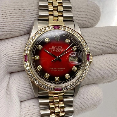 Rolex Datejust 36mm Yellow Gold Steel Custom Bezel Red Diamond Dial Watch 16233