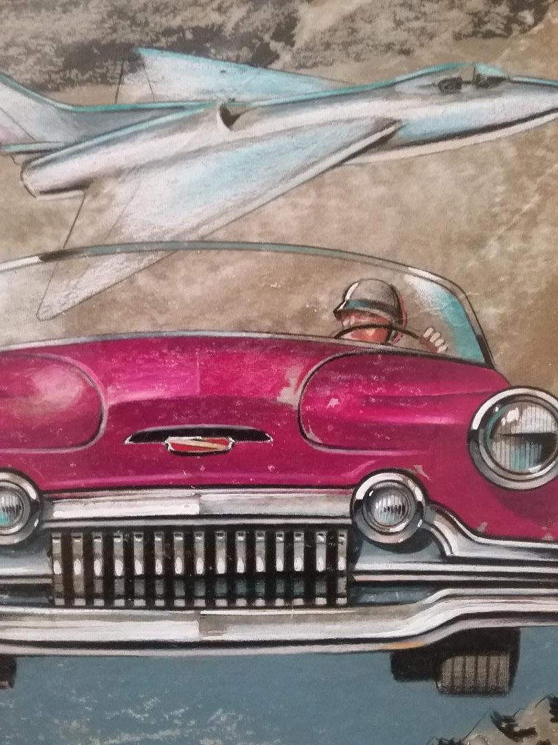 This unique piece is an original artwork, untitled and unsigned, attributed to the late Samuel Shapiro (1921-1999), believed to have been crafted in the early 1950s. The painting showcases a striking magenta 1950s Buick concept vehicle, depicted with a military figure at the wheel casting a glance at a stylized, attractive extraterrestrial female figure, with a jet aircraft looming in the backdrop.