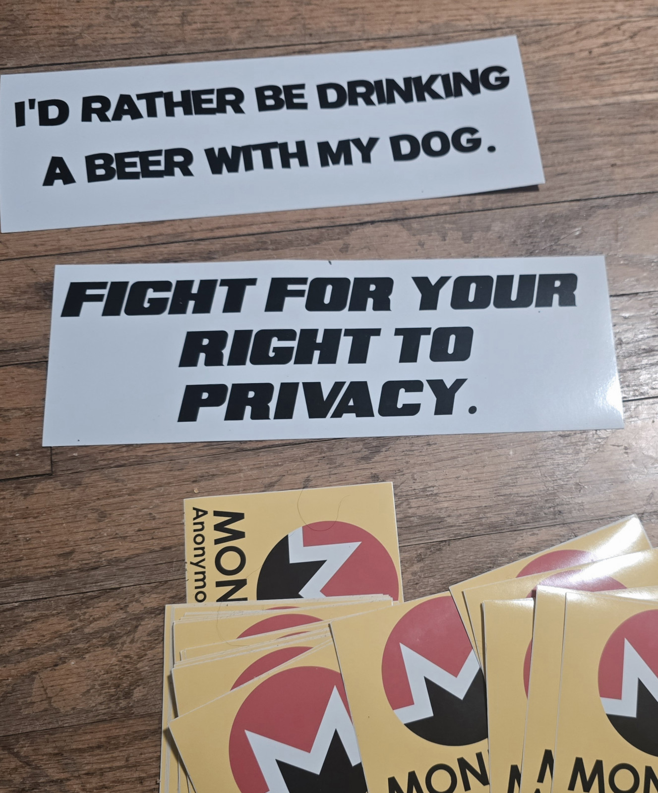 Includes two bumper stickers and a handful of monero anonymous money stickers.