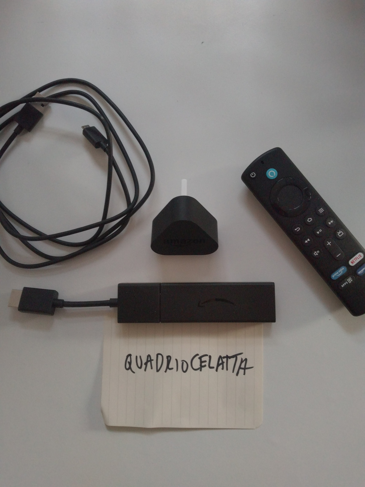 Firestick with UK plug, cable and remote.