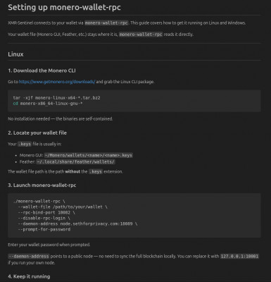 - SETUP.md with monero-wallet-rpc step-by-step instructions