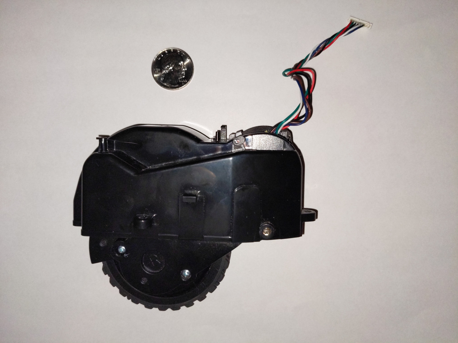 What I need: The right wheel to a model GRV-1010 robotic vacuum (Photo included, ask for more if needed) (The coin in the photo is a quarter for size reference)