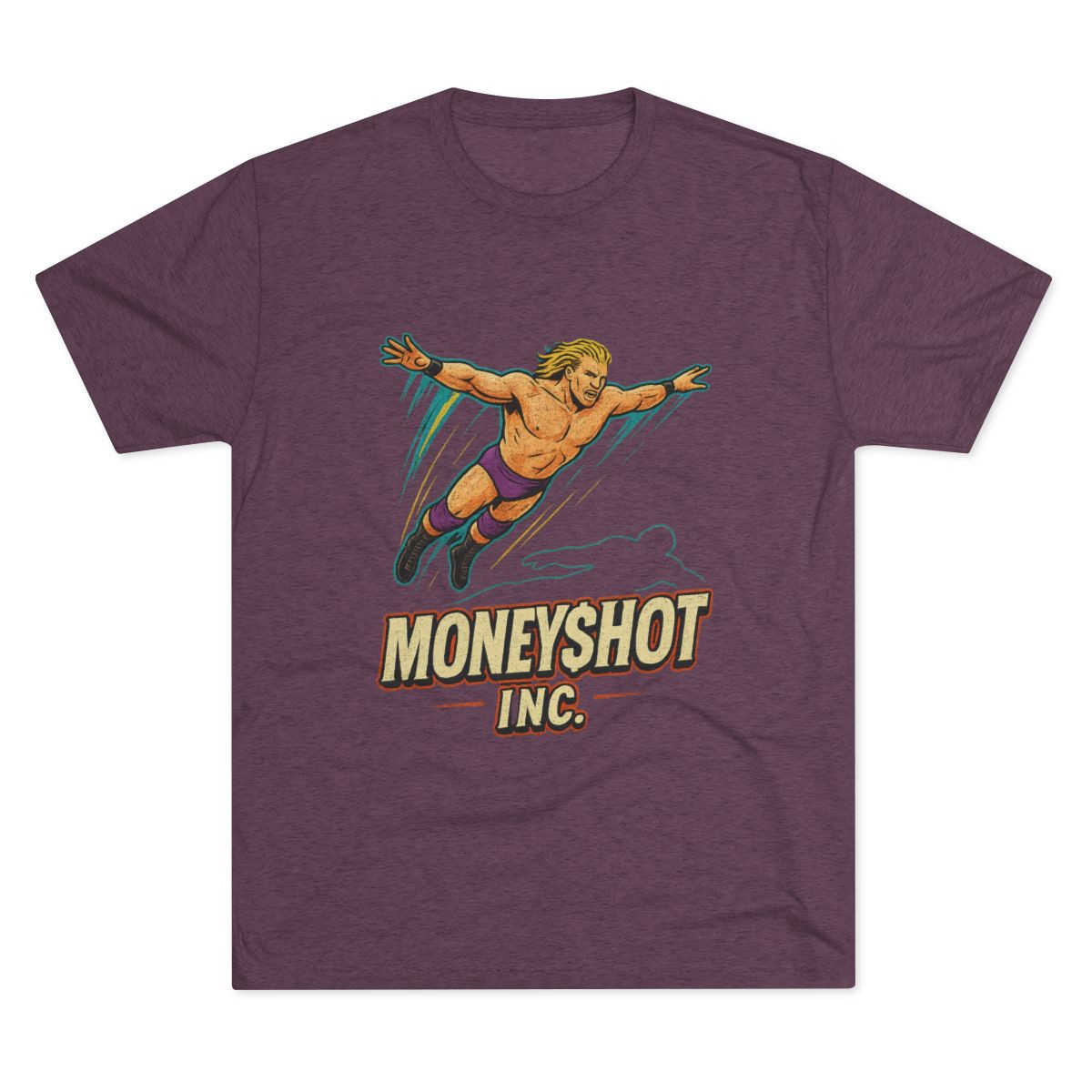 Step into a retro-sports fantasy with this soft tri-blend crew tee featuring the one and only Val Venis in full mid-flight glory. The vintage-style graphic captures the legendary Moneyshot moment—Val launching forward with trails of color blazing behind him, anchored by bold “MONEYSHOT INC.” lettering across the front. The lightweight, drapey fabric wears like an old favorite from day one, while the heathered finish gives it that authentic, worn-in charm worthy of classic attitude-era nostalgia. Perfect under a denim jacket for weekend hangouts, a wrestling watch party, or any day you’re channeling that signature Val Venis mix of charisma, humor, and wink-at-the-camera bravado.