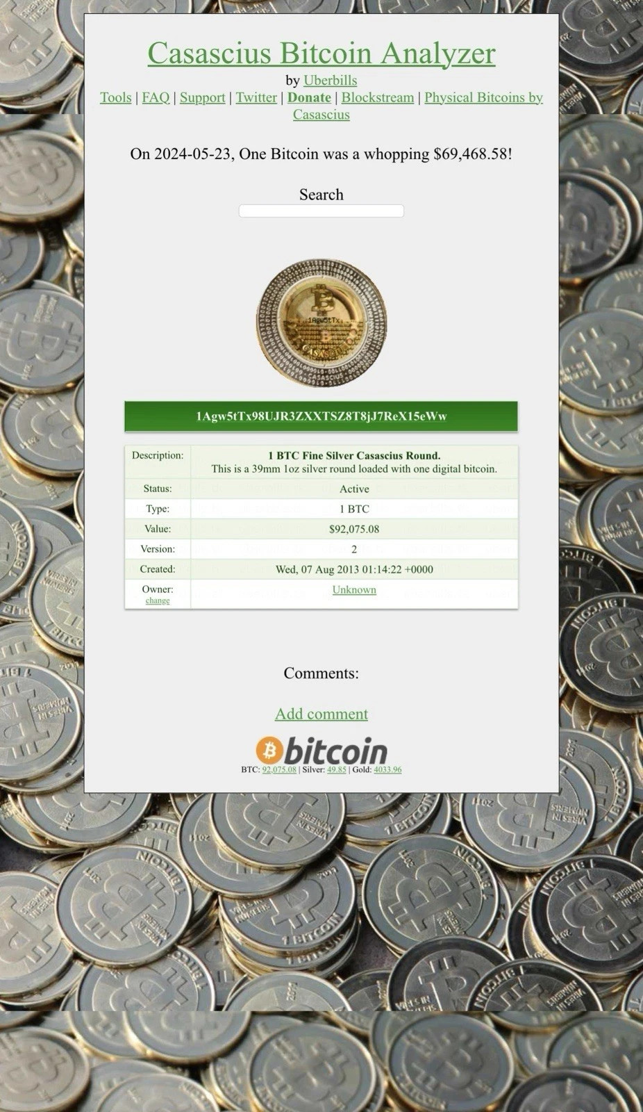 2013 1BTC. Casascius Silver and funded , excellent, 1 out of 1300 ever made.