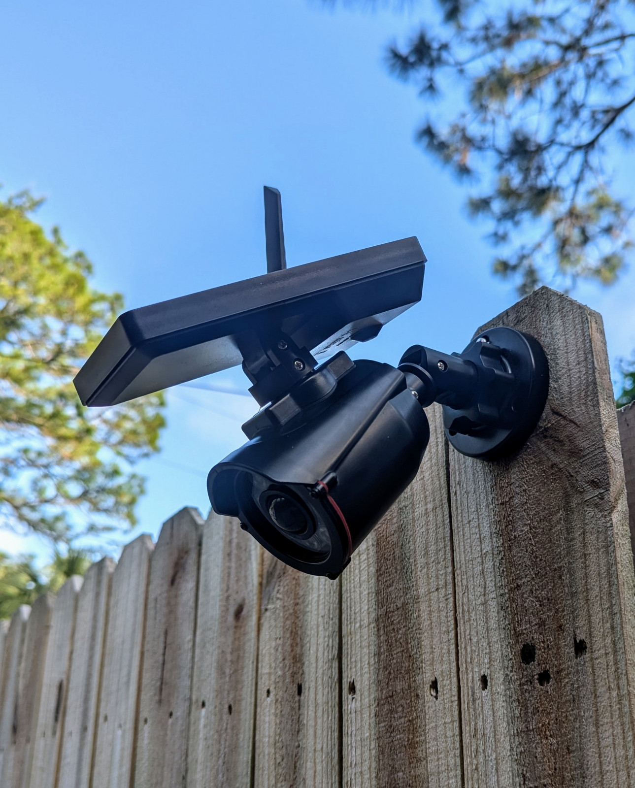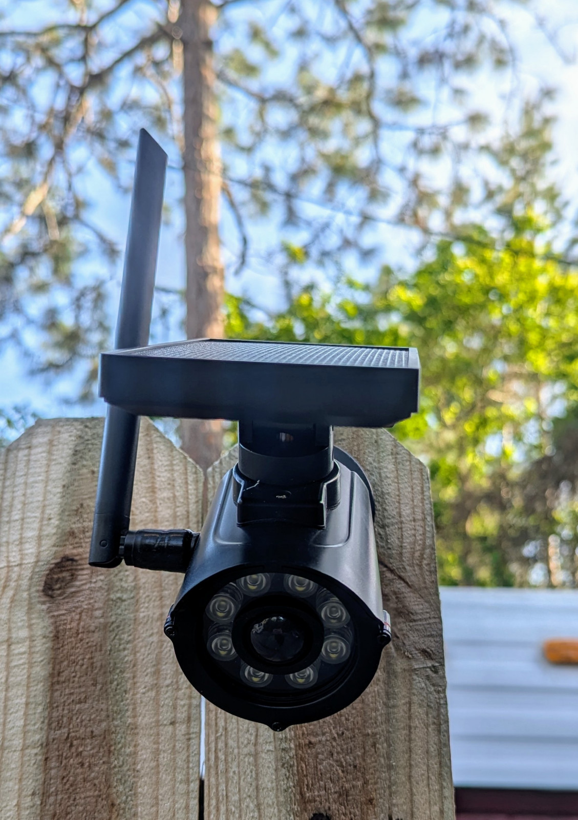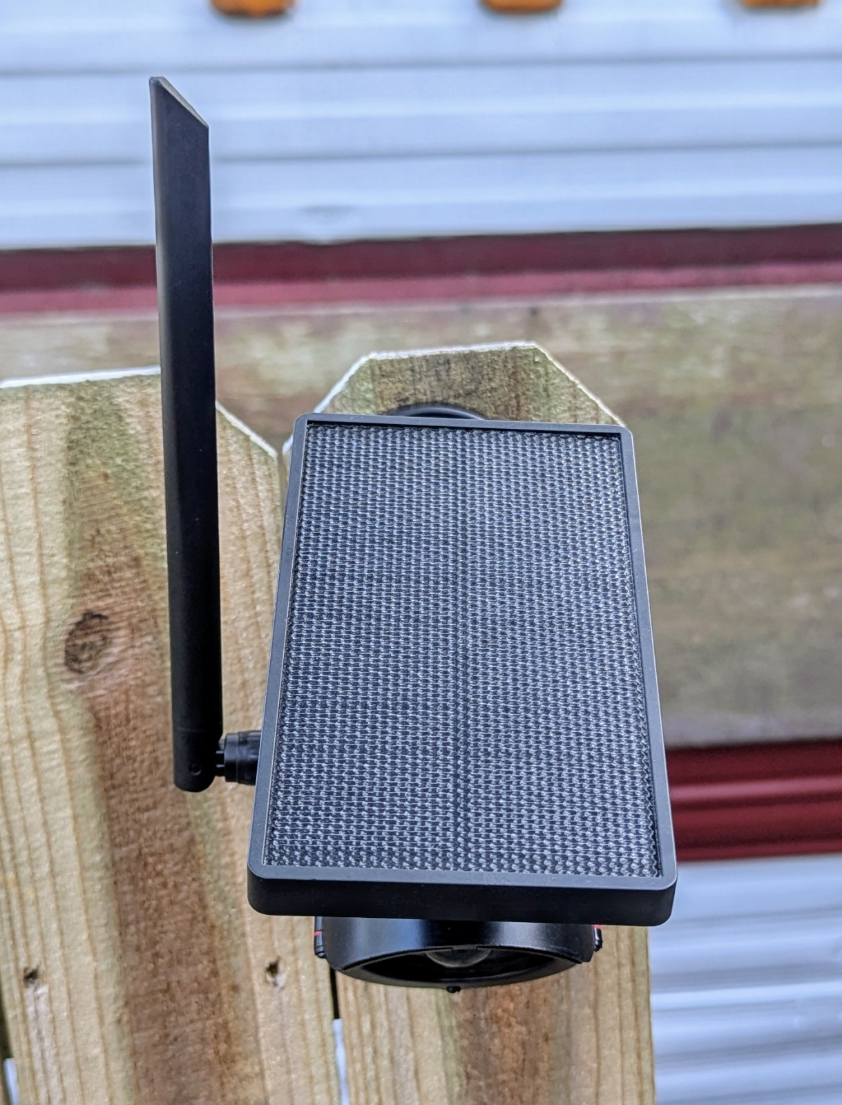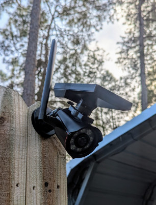 Solar-powered repeater disguised as a security camera, stealthy and weatherproof.