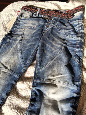 This is my second paracord belt with a double cobra stitch and a 5.1cm wide buckle. The ends are easy to snip in case of a survival need. The length of the belt is 112cm. You can see in the second picture how it fits around the waist of a pair of jeans size 34.