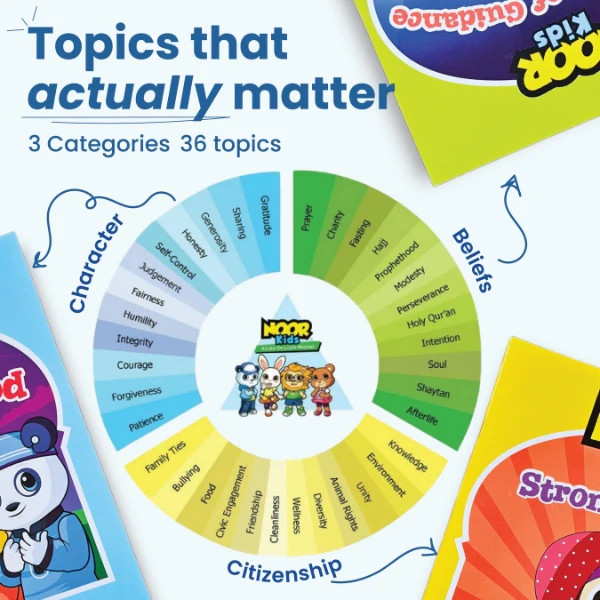 This isn't a random stack of stories. It’s a carefully designed system that builds faith and character step by step, using Noor Kids’ 36-theme framework.