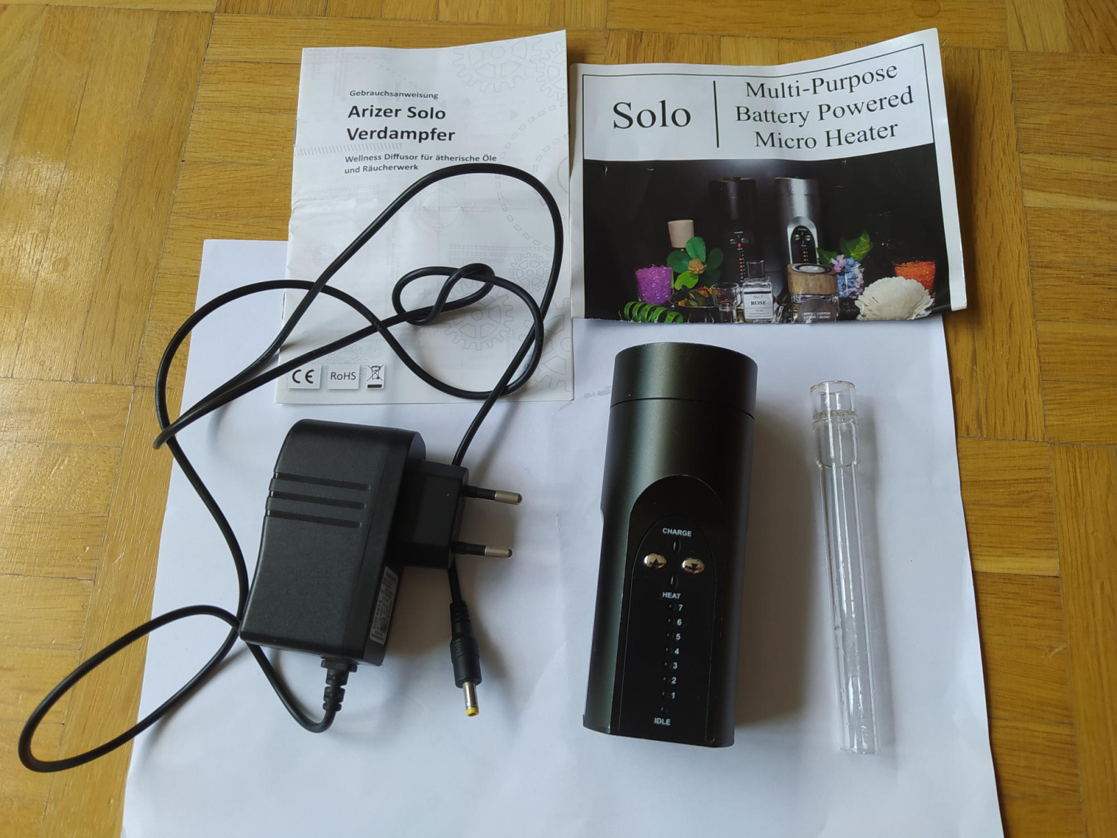 Comes with one long stem, charger and manuals in English and German.