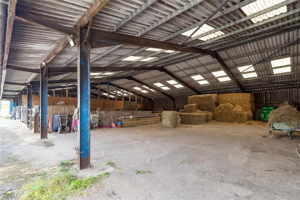 Substantial steel portal outbuilding housing five stables, rug store, feed store, hay store, loose box, machinery store.