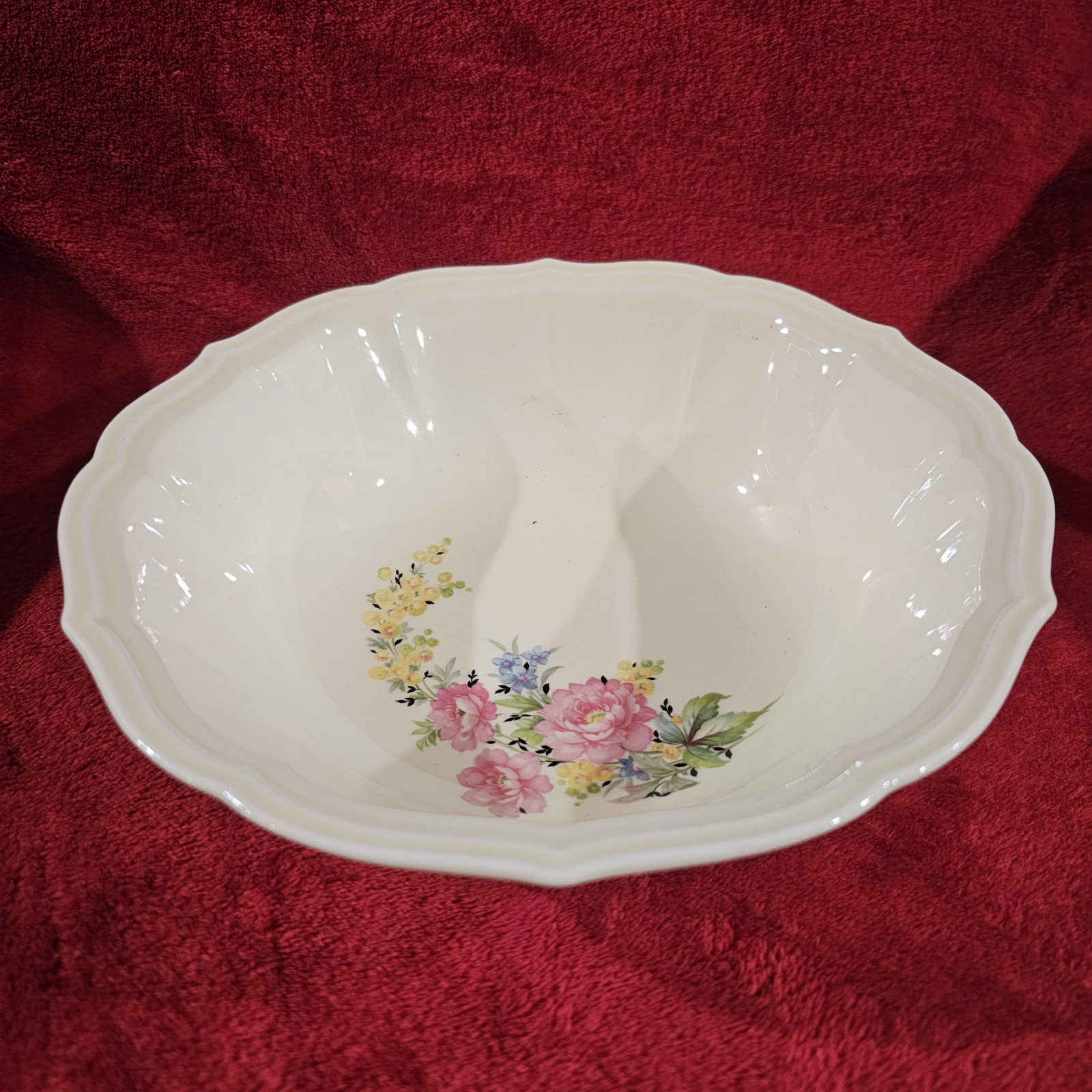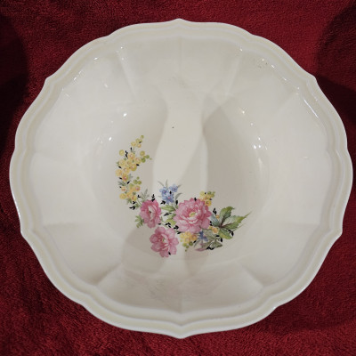 This bowl was produced in the late 1930s to early 1940s. Ornate rim design, good condition, doesn't show any signs of wear or use.