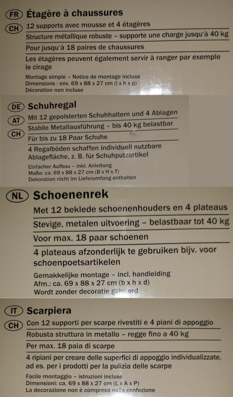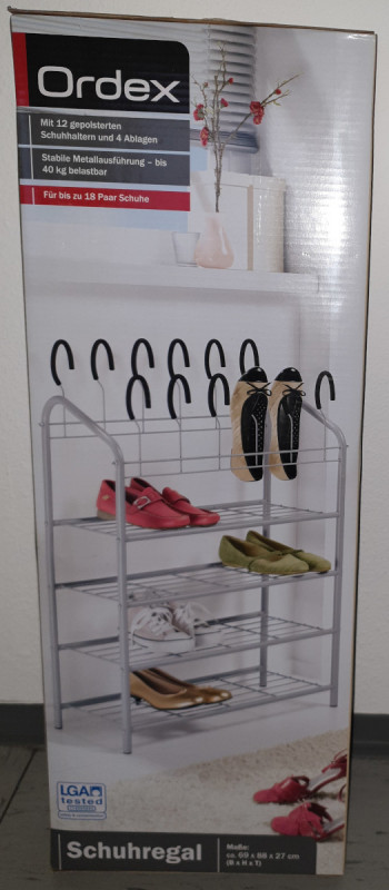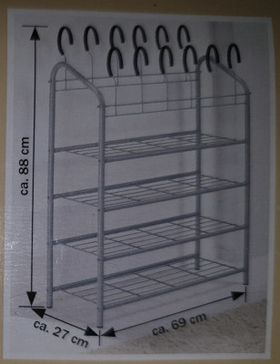 Offering an unused shoe shelf with 4 trays and 12 padded shoe holders, made from metal, still mint/unopened condition