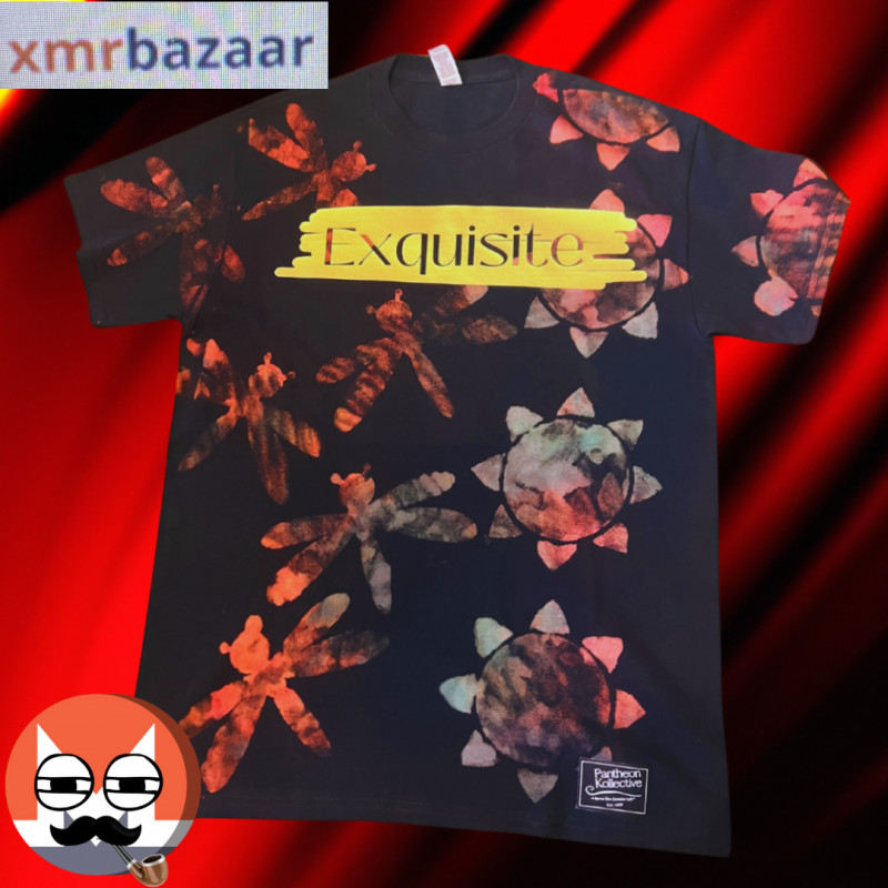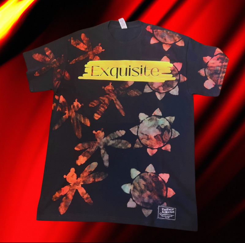 Introducing the "Exquisite Sun & Dragonfly" Tee by Pantheon Kollective. This unique and vibrant t-shirt features an eye-catching design with fiery red and orange dragonflies and whimsical sun motifs scattered across a rich black backdrop. The bold golden "Exquisite" text in a brushstroke style adds a striking contrast, making a powerful statement. Cotton fabric for comfort and durability, this shirt is perfect for anyone looking to add an artistic and bold piece to their wardrobe. Whether you're out and about or relaxing with friends, this tee is sure to turn heads and showcase your exquisite taste.