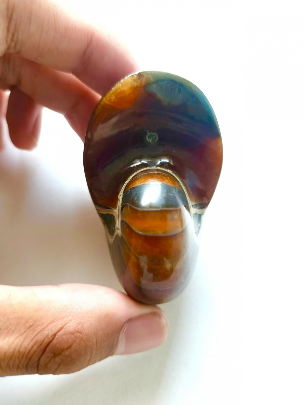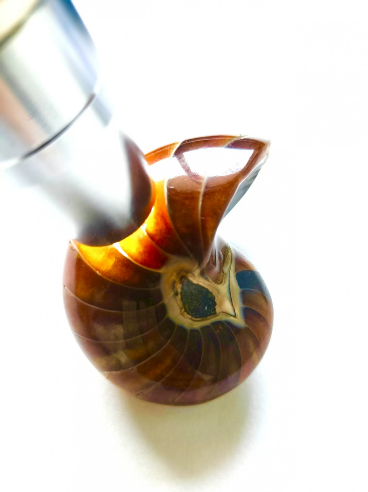 Nautilus fossil, perfectly replaced by calcite, transparent when lit, head mineralized with marine clay