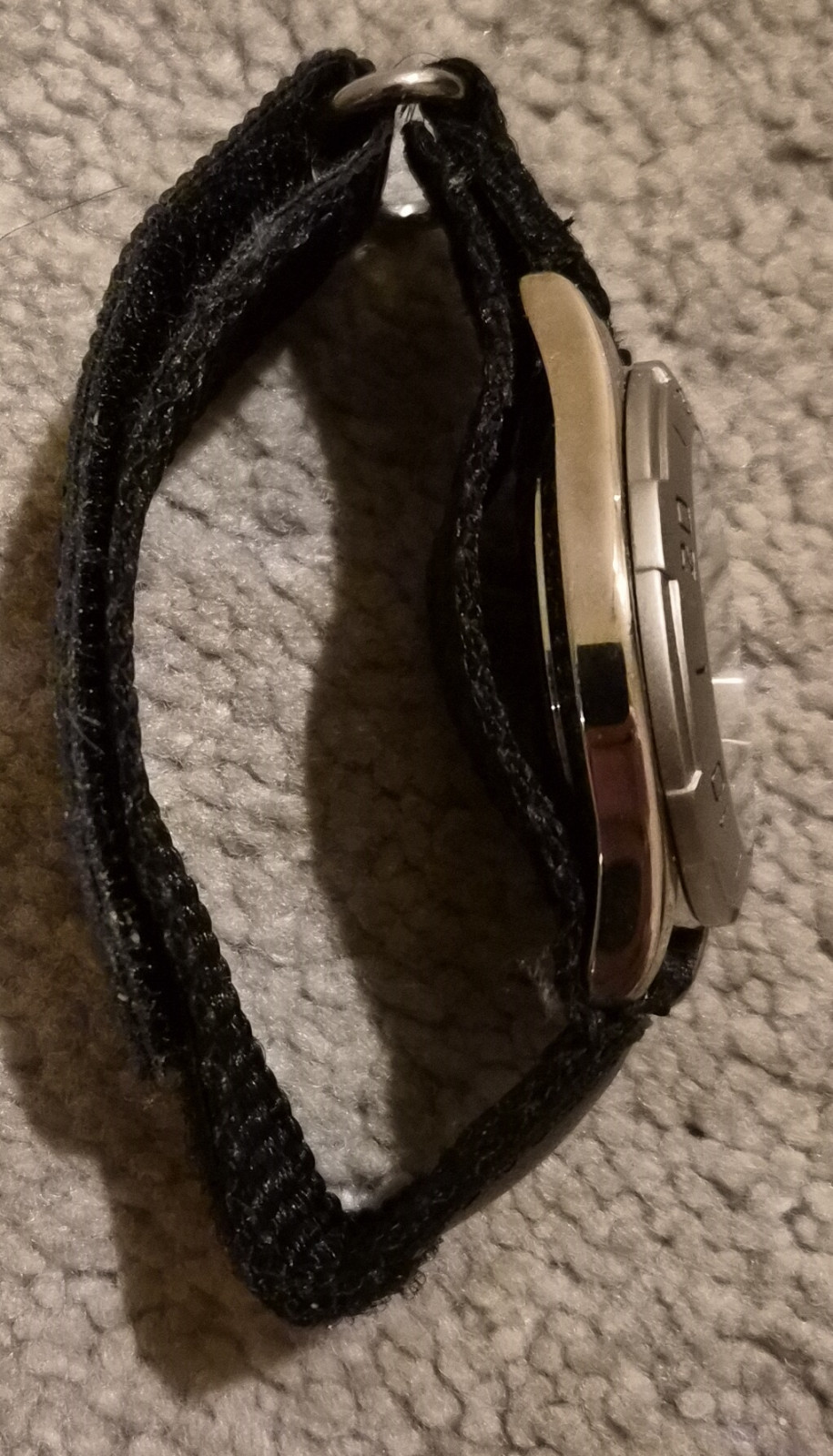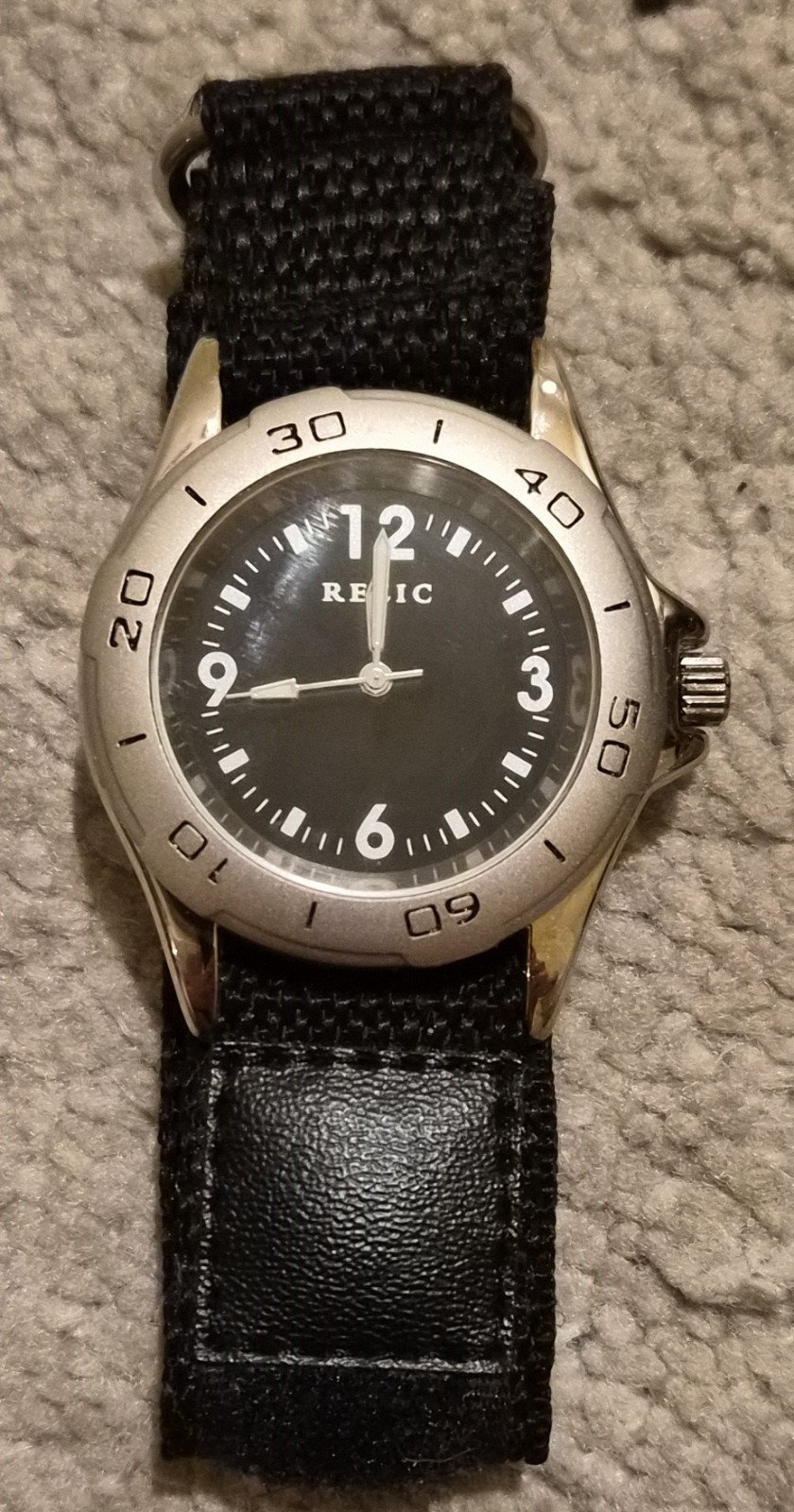 New, out of package. Has velcro wristband installed. Needs battery replaced. The bezel turns so you can set zero to the minute hand and this allows you to countdown time up to an hour.