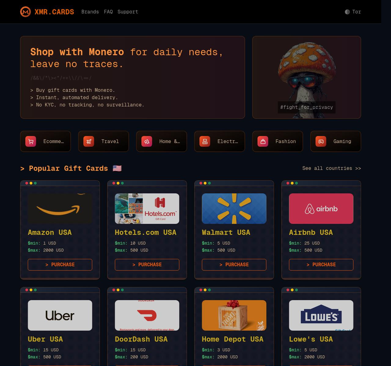 XMR.CARDS: Buy gift cards with Monero | NO KYC | TOR