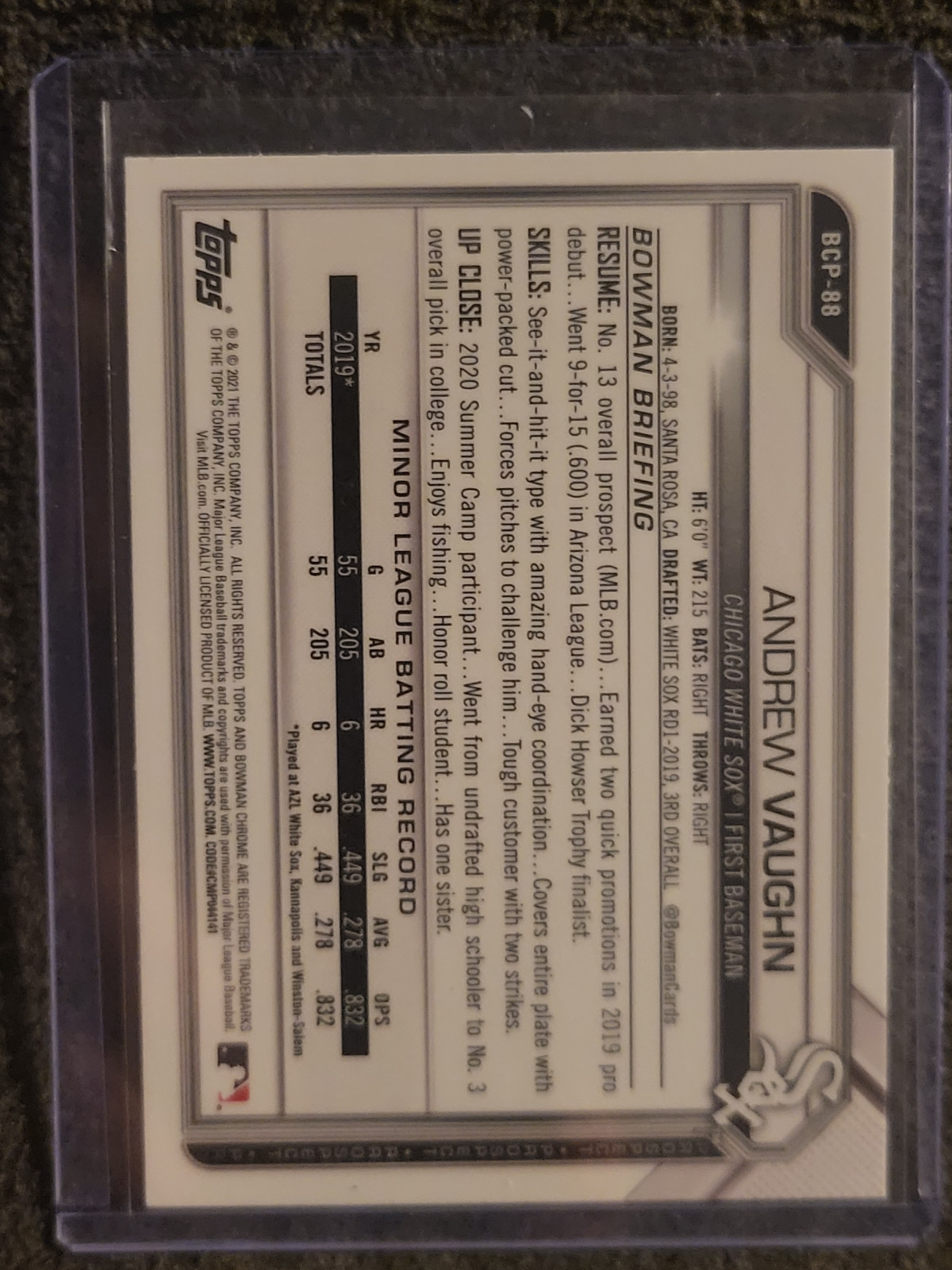 Andrew Vaughn 2021 Bowman Chrome Prospect Rookie Card #BCP-88 Chicago White Sox