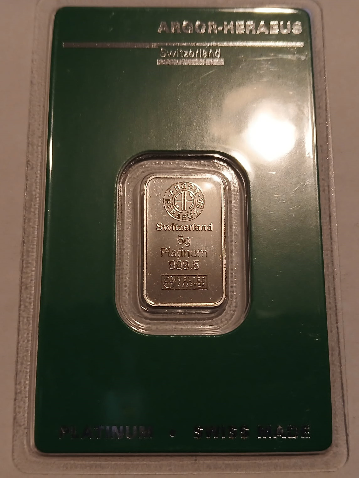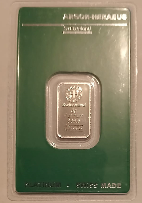 PLATINUM 5 Gram Bar Argor-Heraeus Certified in Assay Unopened 999.5 Fine