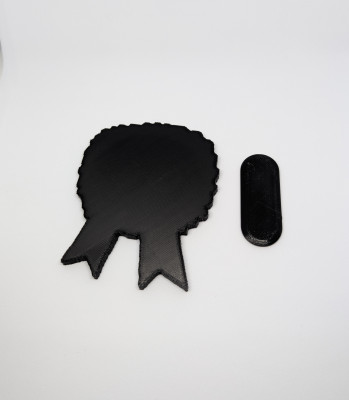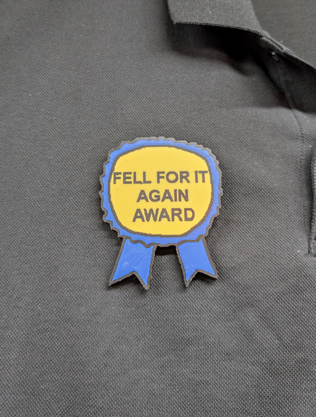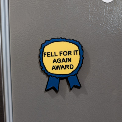 This is a 3D printed "Fell For It Again Award" magnet. It has a couple of embedded disk magnets and should stick to anything magnetic pretty well. Also comes with a small TPU backer (also with embedded disk magnets) that can be used to wear it on a shirt or something.