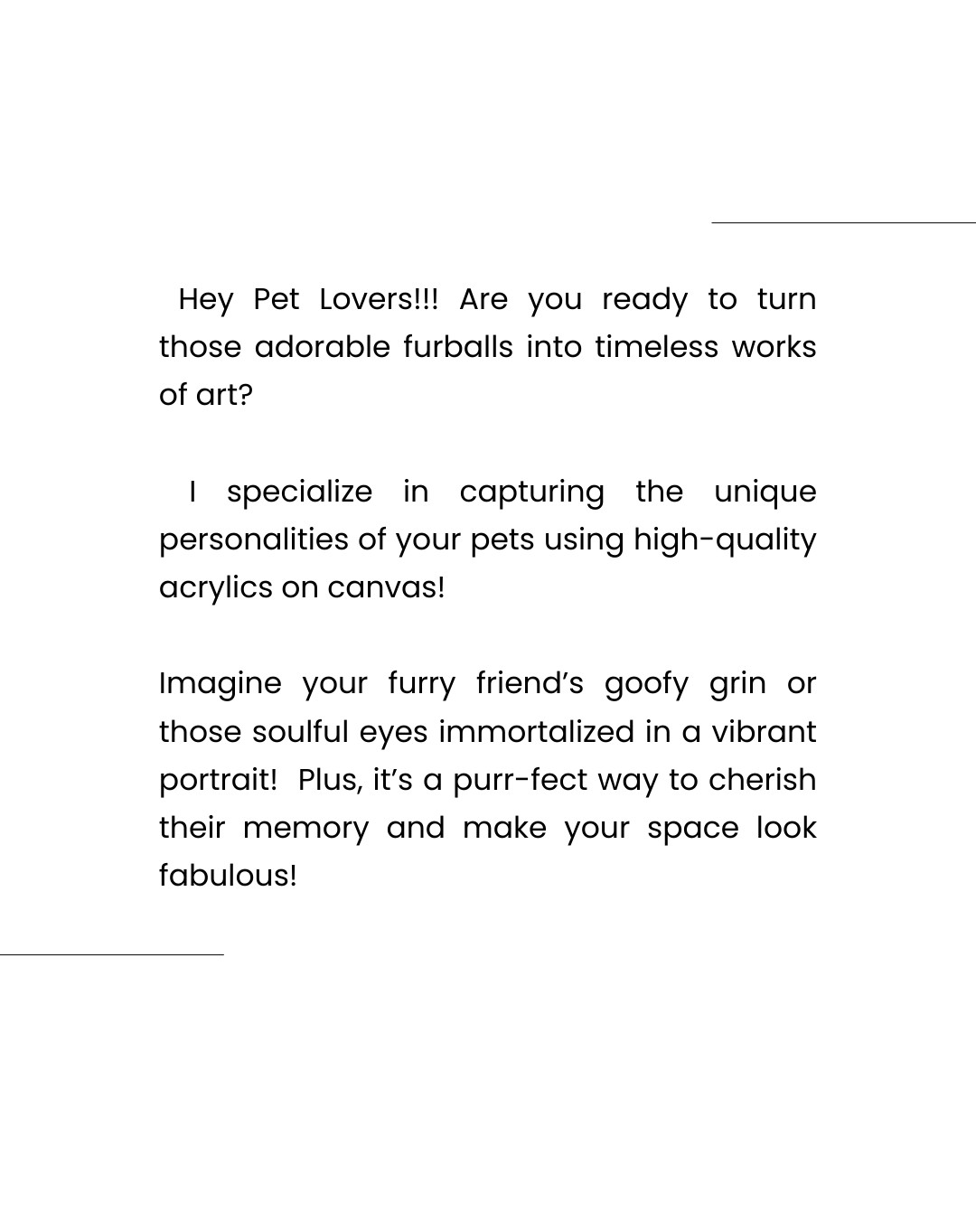 I specialize in capturing the unique personalities of your pets using high-quality acrylics on canvas!