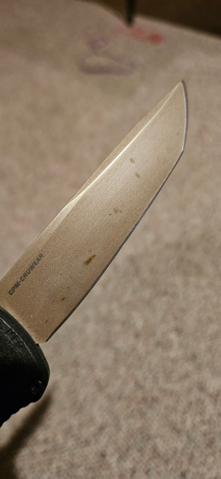 Lightly carried. Factory edge. Used it to cut a summer sausage once and the salt left some spots on the blade