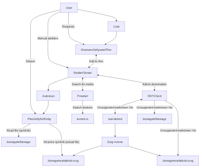 4. RDTClient adds the torrent to Real-Debrid, and then monitors the zurg rclone mount to confirm the download has succeeded. Upon success, RDTClient symlinks the download to Radarr/Sonarr's completed directory, and they process is as if it were a local download (renaming and moving to the media path)