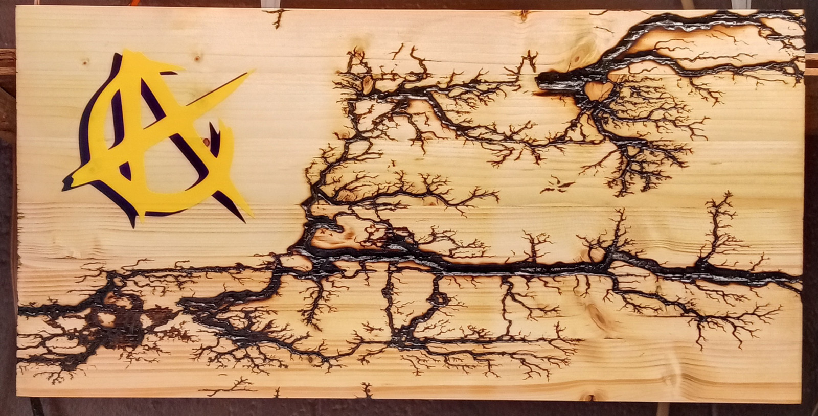 This is a one of a kind Lichtenberg ANCAP flag wall piece. Lichtenberg figures are made by electrocution & no 2 figures are ever the same. The back has a French cleat to hang it with, bumpers to protect the wall & my QR code. It measures 12” x 23 & 3/4” & is sealed for moisture protection. $200