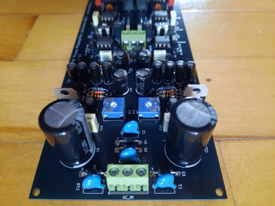 The circuit should be supplied from a 24-0-24 VAC transformer (not included). It has input from MC or MM phono (adjustable type and load capacity of cartridge by jumpers) and line-level output.