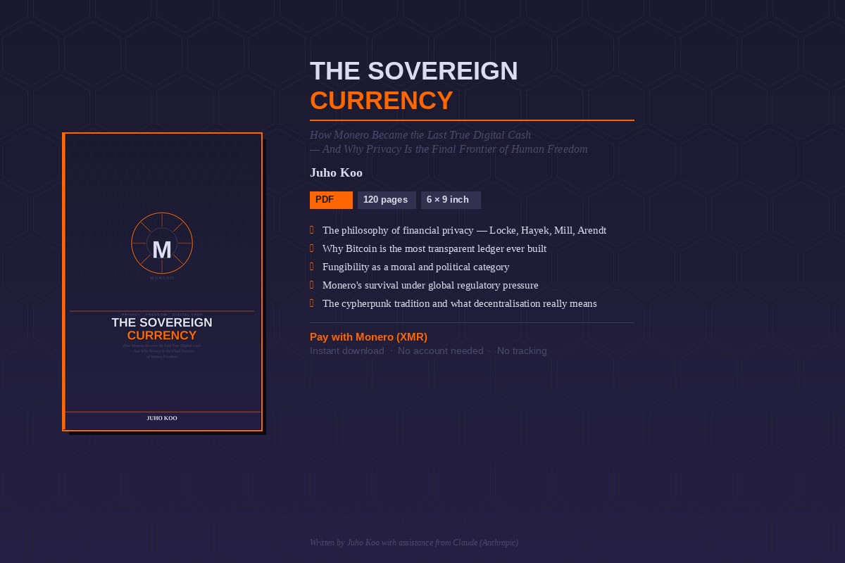 This book makes the philosophical case for financial privacy from first principles — through Locke, Hayek, Mill, and Arendt — then traces how Bitcoin became the most transparent ledger ever built, and argues that Monero is the most serious attempt yet made to restore the financial sovereignty that surveillance capitalism has quietly dismantled.