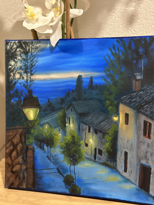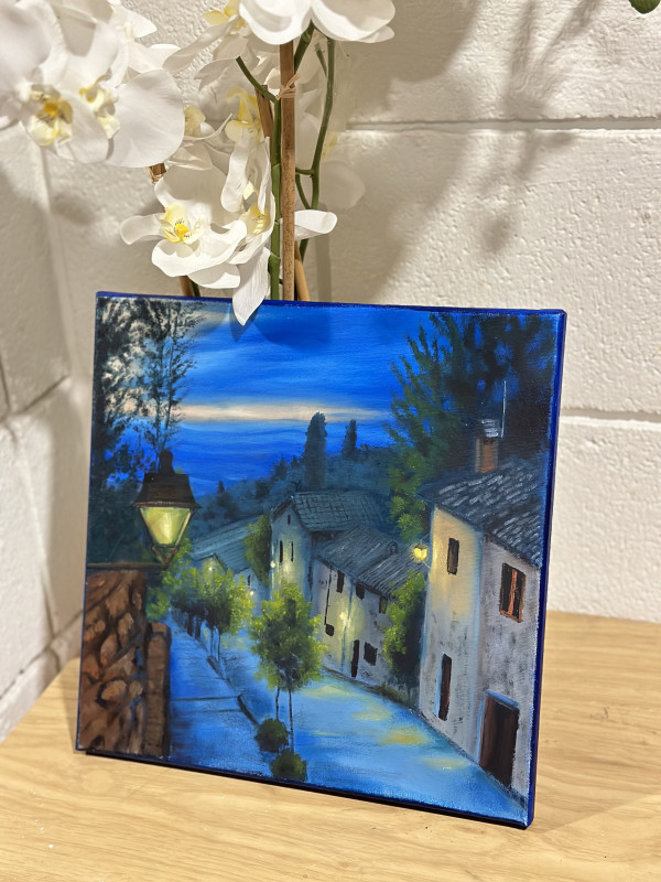 "Blue Hour," is a hand-painted oil painting depicting a town amidst the bright blue evening sky, 12 x 12 inches.
