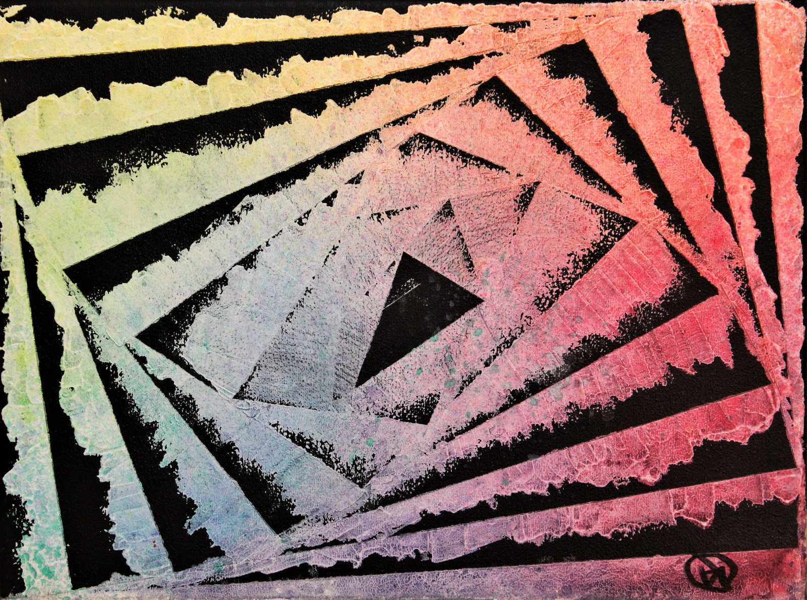 This abstract artwork features a striking geometric composition with layered, angular forms radiating inward, creating a sense of movement and depth. The color palette transitions smoothly from soft green and pale blue tones to warm pinks and reds, set against a deep black background that enhances contrast and visual intensity.