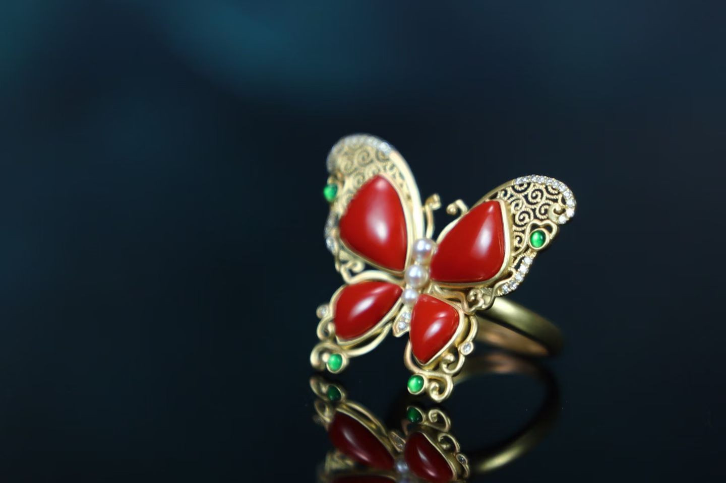 【18k Gold Butterfly Jade Ring】 Made from top-grade Wasi agate, a fully colored and lustrous red jade with a clean base color, rich gelatinous texture, and a delicate, oily sheen. Exquisitely crafted, of extremely high quality, flawless with no glue, cracks, or imperfections.
