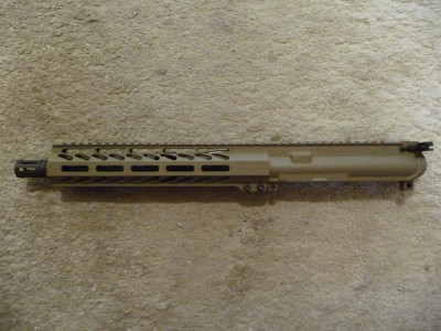 Complete upper. Never fired. Has a cosmetic blemish on the bottom of the receiver as pictured. Coated in coyote brown.