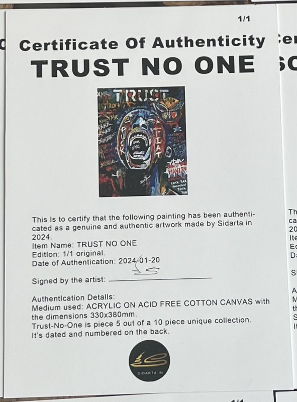 "TRUST NO ONE" is a piece from a series of 10 artworks released by SID in Jan 2024.