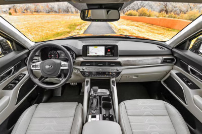 Safety features include lane-keeping assist and adaptive cruise control, ensuring a secure journey. The Telluride's smooth ride and ample cargo space make it suitable for both city driving and long-distance travel.