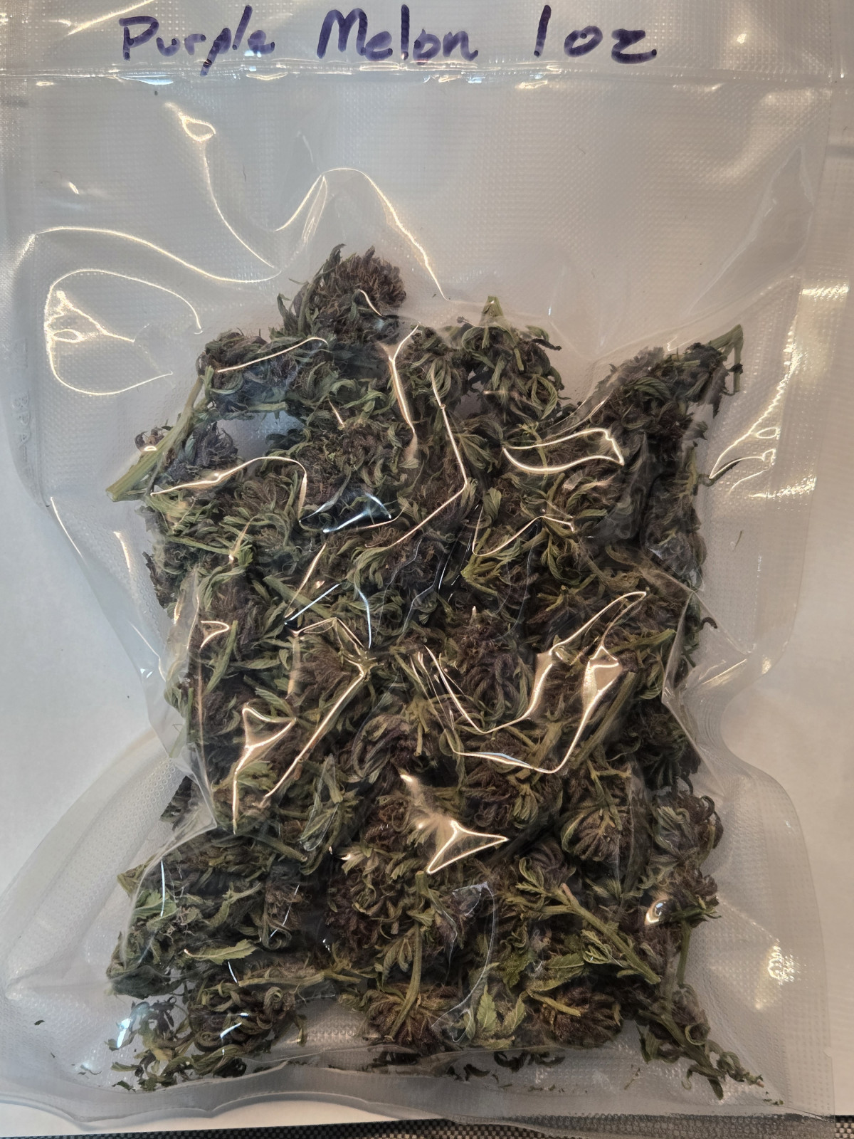 1oz of our Novel strain Purple Melon, Purple as they come! Indica Dominant. Grown Organically! Trimmed, cured, flash frozen, then sealed. Free Ship to Canada.