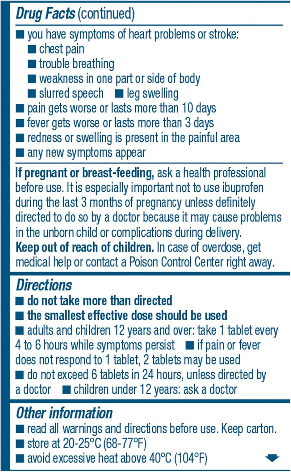 Take these 200mg ibuprofen caplets as directed, taking one tablet every 4 to 6 hours while symptoms persist, or two caplets if pain or fever does not respond to one tablet